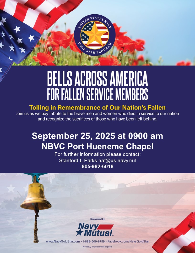 Join us as we pay tribute to the brave men and women who died in service to our nation and recognize the sacrifices of those who have been left behind. The Navy Gold Star Program would like to invite you to the 2025 Bells Across America Ceremony hosted by Naval Base Ventura County Port Hueneme, CA on September 25 at 9:00 AM PT. If you would like to attend, please RSVP to Stanford.l.parks.naf@us.navy.mil or 805-982-6018. #BellsAcrossAmerica #NavyMutual #NeverForget #NavyGoldStar