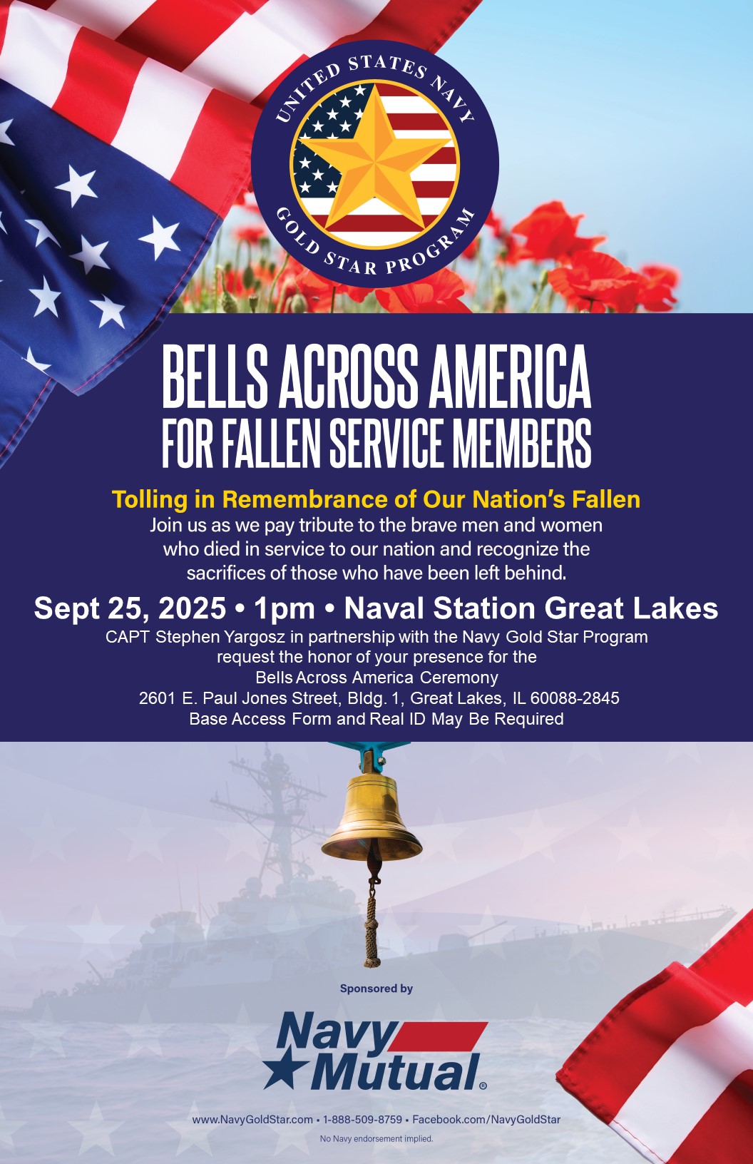 Join us as we pay tribute to the brave men and women who died in service to our nation and recognize the sacrifices of those who have been left behind. The Navy Gold Star Program would like to invite you to the 2025 Bells Across America Ceremony hosted by Naval Station Great Lakes, IL on September 25, at 1:00 PM CT. If you would like to attend, please RSVP to Maura Bradshaw at maura.h.bradshaw.naf@us.navy.mil. #BellsAcrossAmerica#NavyMutual#NeverForget#NavyGoldStar