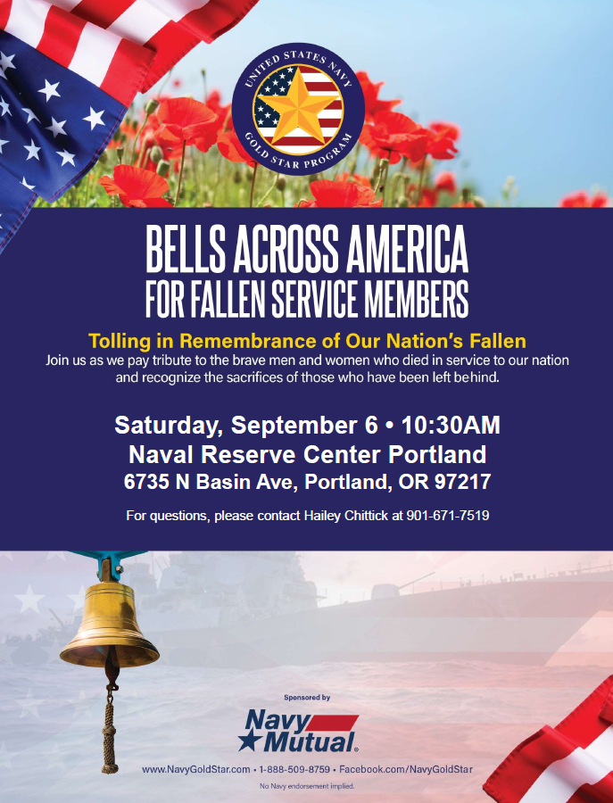 Join us as we pay tribute to the brave men and women who died in service to our nation and recognize the sacrifices of those who have been left behind. The Navy Gold Star Program would like to invite you to the 2025 Bells Across America Ceremony hosted by Naval Reserve Center Portland, OR on September 6 at 10:30 AM PT. If you would like to attend, please RSVP to Hailey Chittick at 901-671-7519. #BellsAcrossAmerica #NavyMutual #NeverForget #NavyGoldStar