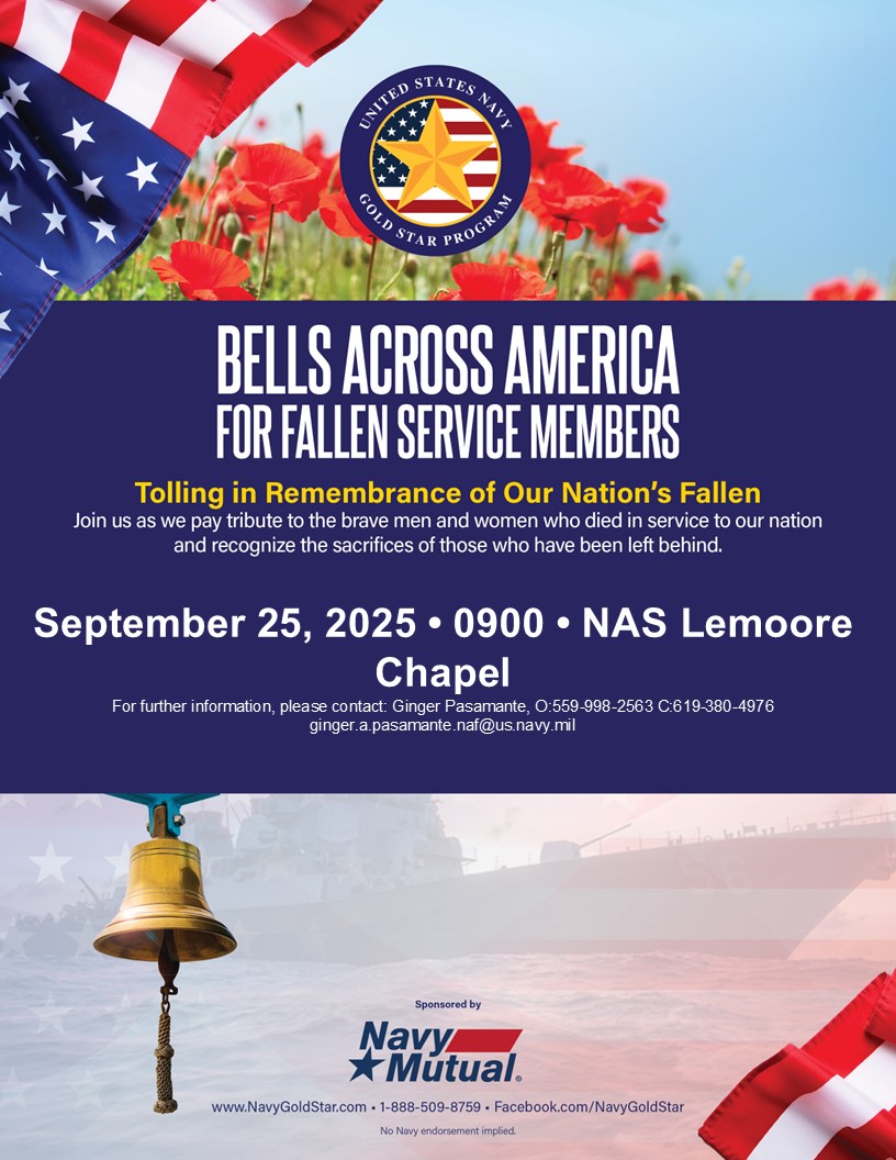Join us as we pay tribute to the brave men and women who died in service to our nation and recognize the sacrifices of those who have been left behind. The Navy Gold Star Program would like to invite you to the 2025 Bells Across America Ceremony hosted by Naval Air Station Lemoore, CA on September 25 at 9:00 AM PT. If you would like to attend, please RSVP to ginger.a.pasamante.naf@us.navy.mil or 559-998-2563. #BellsAcrossAmerica #NavyMutual #NeverForget #NavyGoldStar
